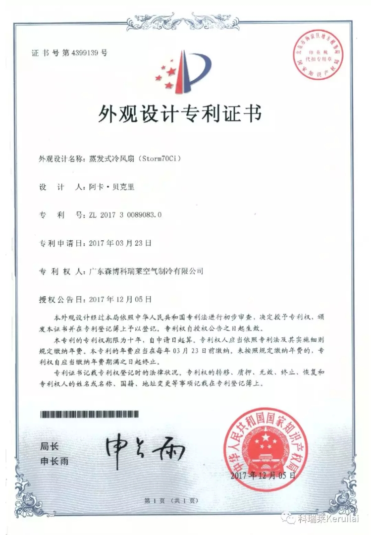 近期,科瑞萊冷風(fēng)扇產(chǎn)品"風(fēng)暴"憑借精美的外觀和優(yōu)良的品質(zhì),榮獲國家知識產(chǎn)權(quán)局頒發(fā)的外觀設(shè)計專利證書。